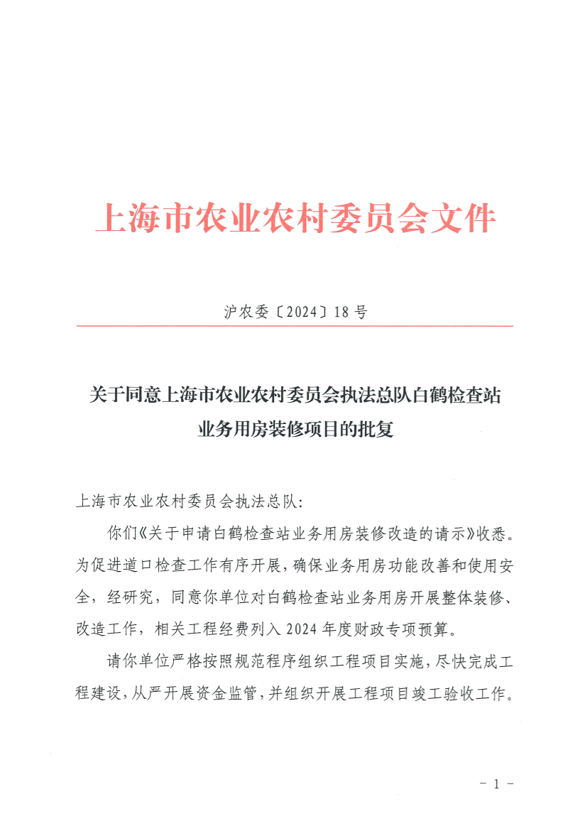 你们《关于申请白鹤检查站业务用房装修改造的请示》收悉。为促进道口检查工作有序开展,确保业务用房功能改善和使用安全,经研究,同意你单位对白鹤检查站业务用房开展整体装修、改造工作,相关工程经费列入2024年度财政专项预算。