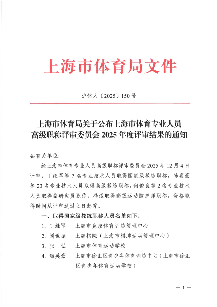 经上海市体育专业人员高级职称评审委员会2025年12月4日评审,丁继军等7名专业技术人员取得国家级教练职称,陈嘉豪等23名专业技术人员取得高级教练职称,何俊良等2名专业技术人员取得副研究员职称,冯煜取得高级运动防护师职称,资格取得时间从评审通过之日起算。
