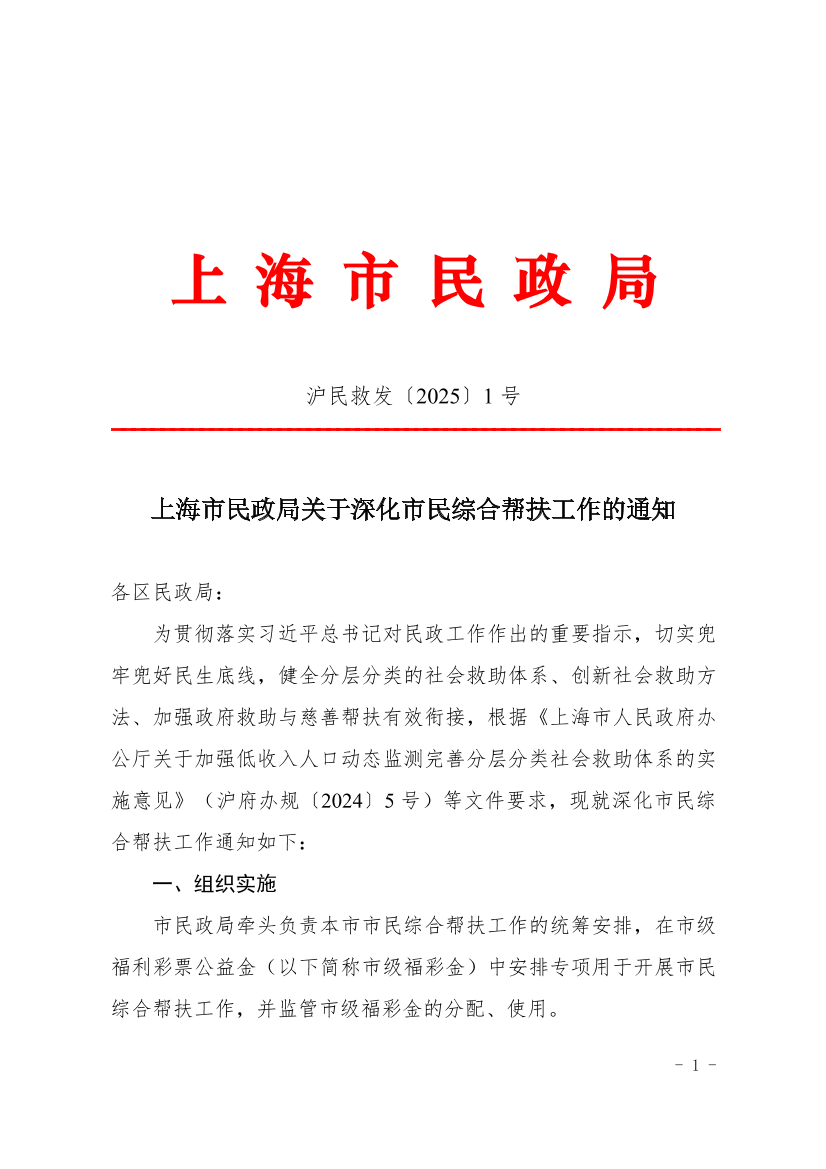 为贯彻落实习近平总书记对民政工作作出的重要指示,切实兜牢兜好民生底线,健全分层分类的社会救助体系、创新社会救助方法、加强政府救助与慈善帮扶有效衔接,根据《上海市人民政府办公厅关于加强低收入人口动态监测完善分层分类社会救助体系的实施意见》(沪府办规〔2024〕5号)等文件要求,现就深化市民综合帮扶工作通知如下: