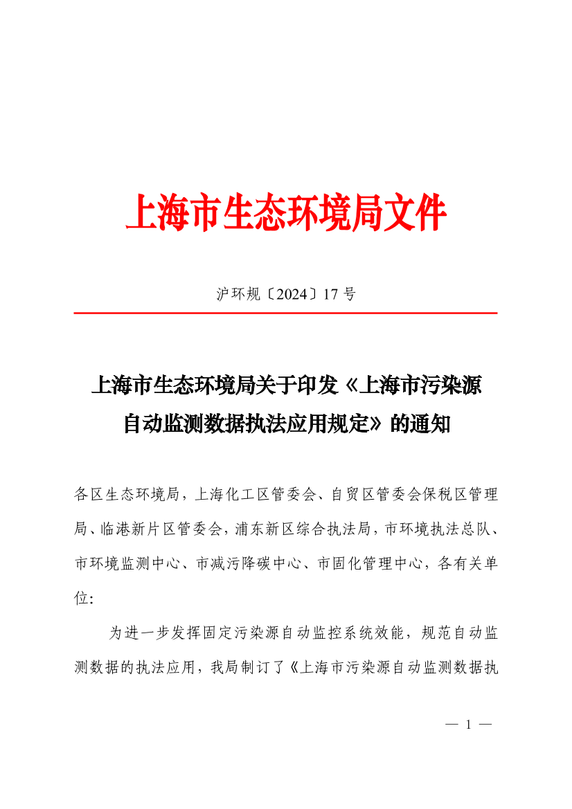 为进一步发挥固定污染源自动监控系统效能,规范自动监测数据的执法应用,我局制订了《上海市污染源自动监测数据执法应用规定》,自2024年12月1日起实施。现印发给你们,请遵照执行。