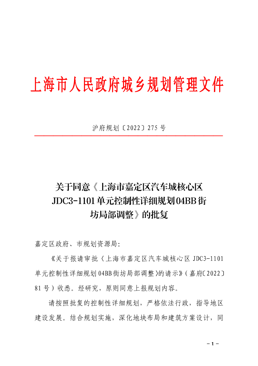 《关于报请审批〈上海市嘉定区汽车城核心区JDC3-1101单元控制性详细规划04BB街坊局部调整〉的请示》(嘉府〔2022〕81号)收悉。经研究,原则同意上报规划内容。