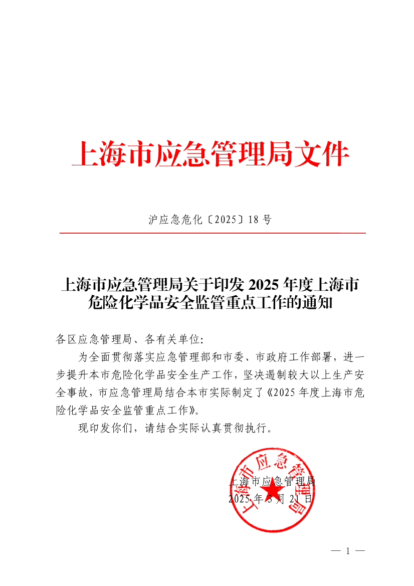 为全面贯彻落实应急管理部和市委、市政府工作部署,进一步提升本市危险化学品安全生产工作,坚决遏制较大以上生产安全事故,市应急管理局结合本市实际制定了《2025年度上海市危险化学品安全监管重点工作》。