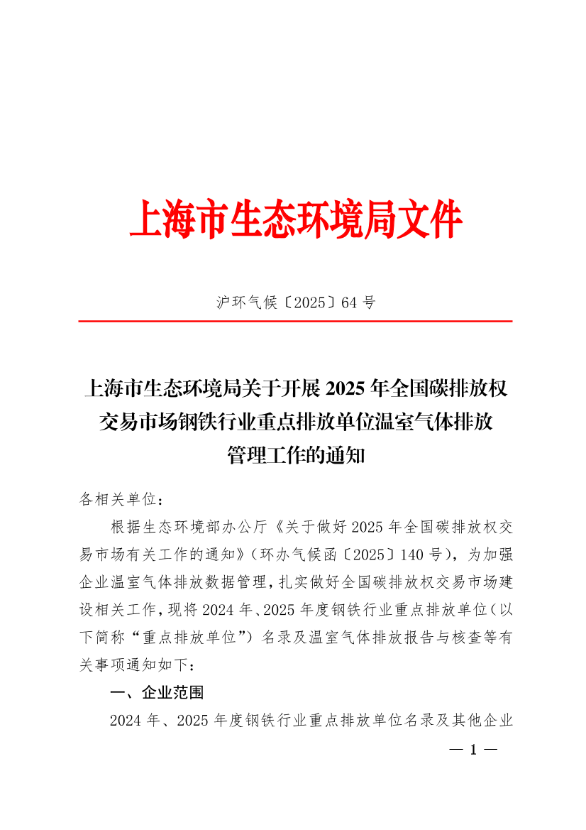 根据生态环境部办公厅《关于做好2025年全国碳排放权交易市场有关工作的通知》(环办气候函〔2025〕140号),为加强企业温室气体排放数据管理,扎实做好全国碳排放权交易市场建设相关工作,现将2024年、2025年度钢铁行业重点排放单位(以下简称“重点排放单位”)名录及温室气体排放报告与核查等有关事项通知如下: