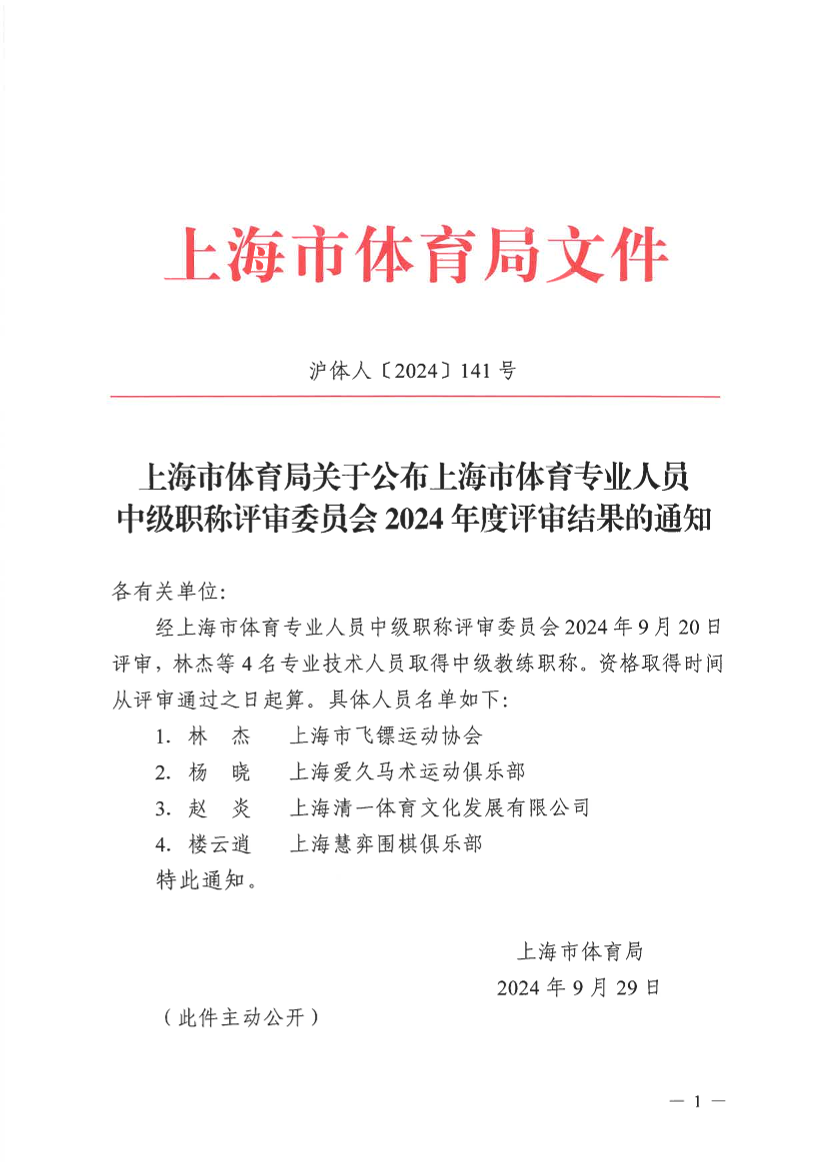 经上海市体育专业人员中级职称评审委员会2024年9月20日评审,林杰等4名专业技术人员取得中级教练职称。资格取得时间从评审通过之日起算。具体人员名单如下: