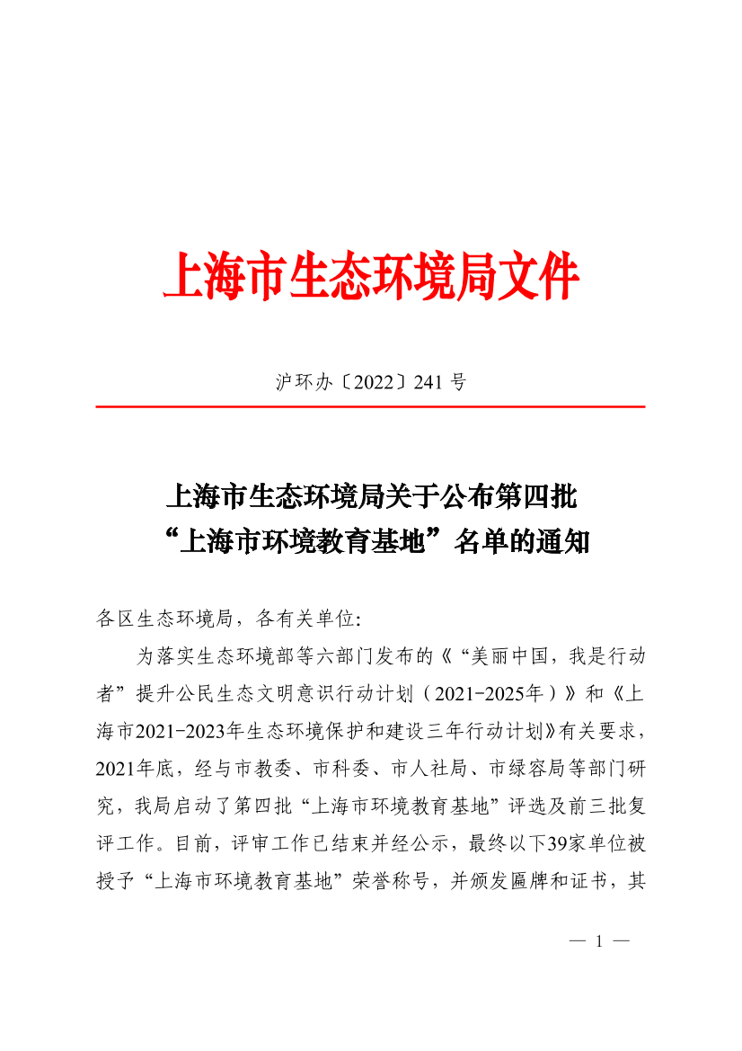 为落实生态环境部等六部门发布的《“美丽中国,我是行动者”提升公民生态文明意识行动计划(2021-2025年)》和《上海市2021-2023年生态环境保护和建设三年行动计划》有关要求,2021年底,经与市教委、市科委、市人社局、市绿容局等部门研究,我局启动了第四批“上海市环境教育基地”评选及前三批复评工作。目前,评审工作已结束并经公示,最终以下39家单位被授予“上海市环境教育基地”荣誉称号,并颁发匾牌和证书,其中新申报15家,复评24家,2家不符合标准的老基地将予以摘牌。