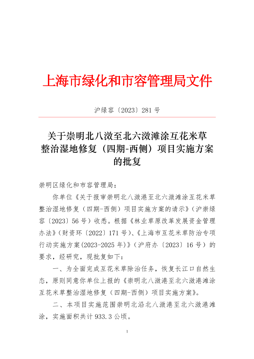 你单位《关于报审崇明北八滧港至北六滧滩涂互花米草整治湿地修复(四期-西侧)项目实施方案的请示》(沪崇绿容〔2023〕56号)收悉。根据《林业草原改革发展资金管理办法》(财资环〔2022〕171号)、《上海市互花米草防治专项行动实施方案(2023-2025年)》(沪府办〔2023〕16号)的要求,经研究,现批复如下:
