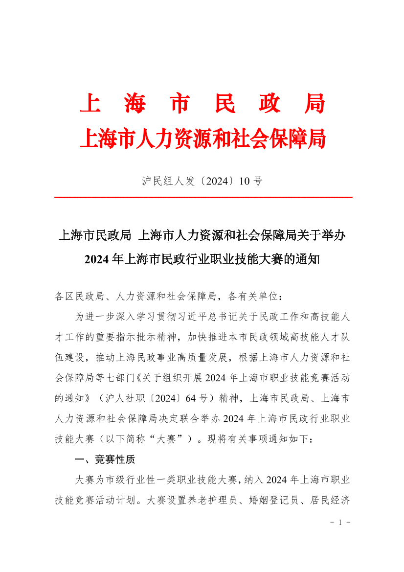 为进一步深入学习贯彻习近平总书记关于民政工作和高技能人才工作的重要指示批示精神,加快推进本市民政领域高技能人才队伍建设,推动上海民政事业高质量发展,根据上海市人力资源和社会保障局等七部门《关于组织开展2024年上海市职业技能竞赛活动的通知》(沪人社职〔2024〕64号)精神,上海市民政局、上海市人力资源和社会保障局决定联合举办2024年上海市民政行业职业技能大赛(以下简称“大赛”)。现将有关事项通知如下: