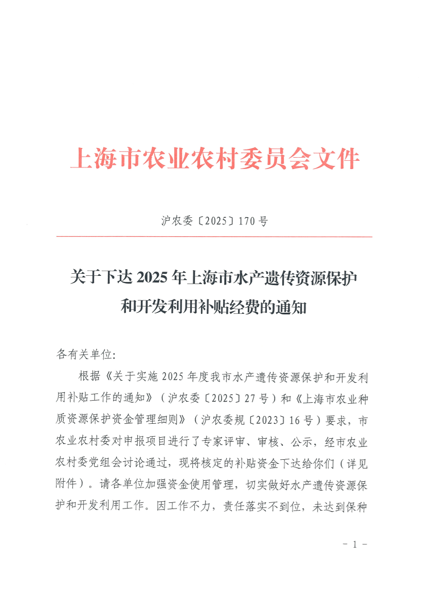 根据《关于实施2025年度我市水产遗传资源保护和开发利用补贴工作的通知》(沪农委〔2025〕27号)和《上海市农业种质资源保护资金管理细则》(沪农委规〔2023〕16号)要求,市农业农村委对申报项目进行了专家评审、审核、公示,经市农业农村委党组会讨论通过,现将核定的补贴资金下达给你们(详见附件)。请各单位加强资金使用管理,切实做好水产遗传资源保护和开发利用工作。因工作不力,责任落实不到位,未达到保种要求,经整改后仍达不到要求,造成资源流失、灭绝等严重后果的,由市农业农村委收回当年财政资金,原则上该单位三年内不能再承担资源保护工作。