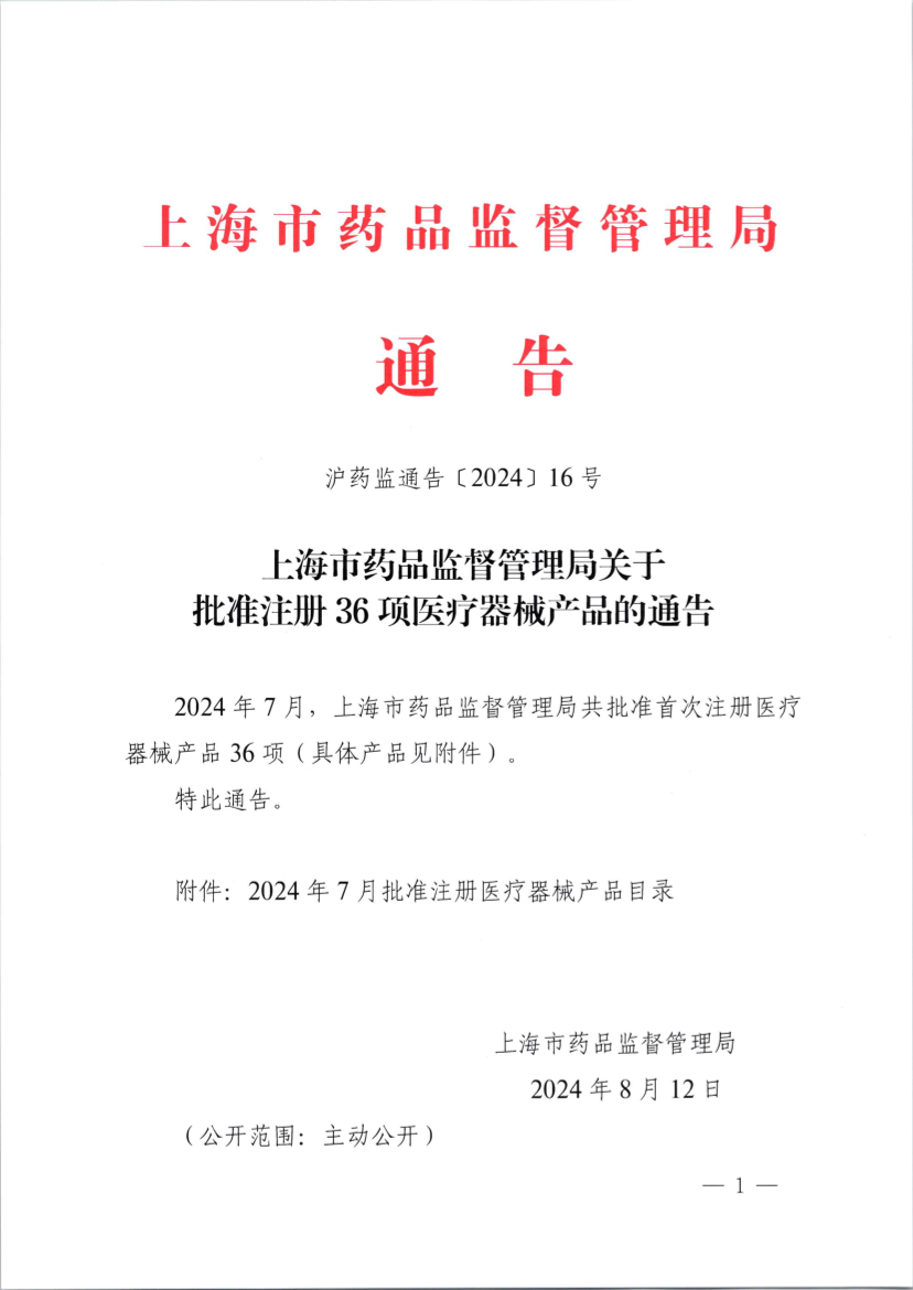 2024年7月,上海市药品监督管理局共批准首次注册医疗器械产品36项(具体产品见附件)。