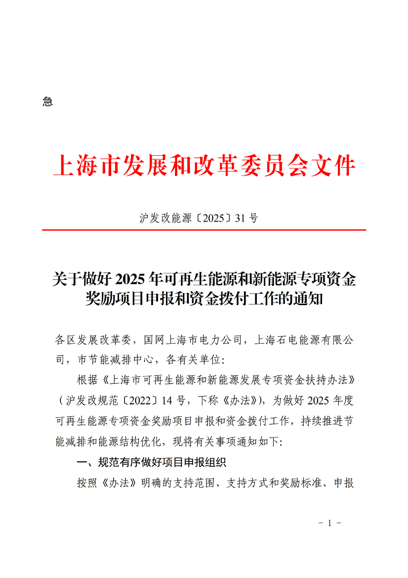 根据《上海市可再生能源和新能源发展专项资金扶持办法》(沪发改规范〔2022〕14号,下称《办法》),为做好2025年度可再生能源专项资金奖励项目申报和资金拨付工作,持续推进节能减排和能源结构优化,现将有关事项通知如下: