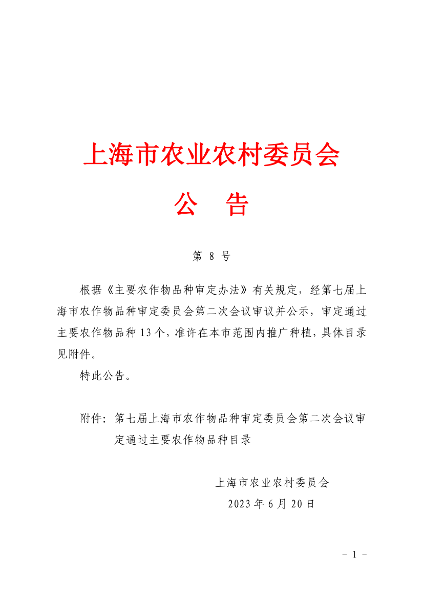 根据《主要农作物品种审定办法》有关规定,经第七届上海市农作物品种审定委员会第二次会议审议并公示,审定通过主要农作物品种13个,准许在本市范围内推广种植,具体目录见附件。