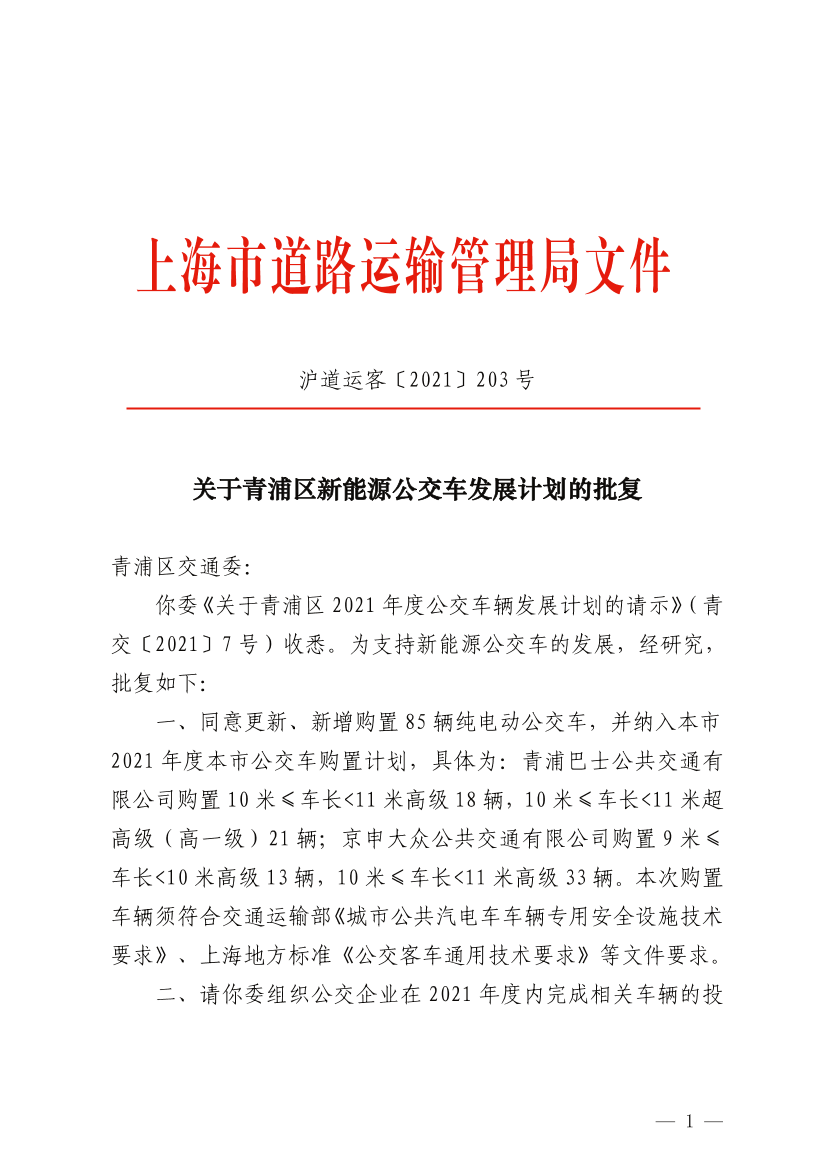你委《关于青浦区2021年度公交车辆发展计划的请示》(青交〔2021〕7号)收悉。为支持新能源公交车的发展,经研究,批复如下: