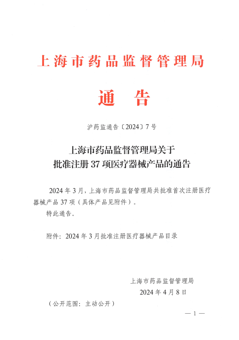 2024年3月,上海市药品监督管理局共批准首次注册医疗器械产品37项(具体产品见附件)。