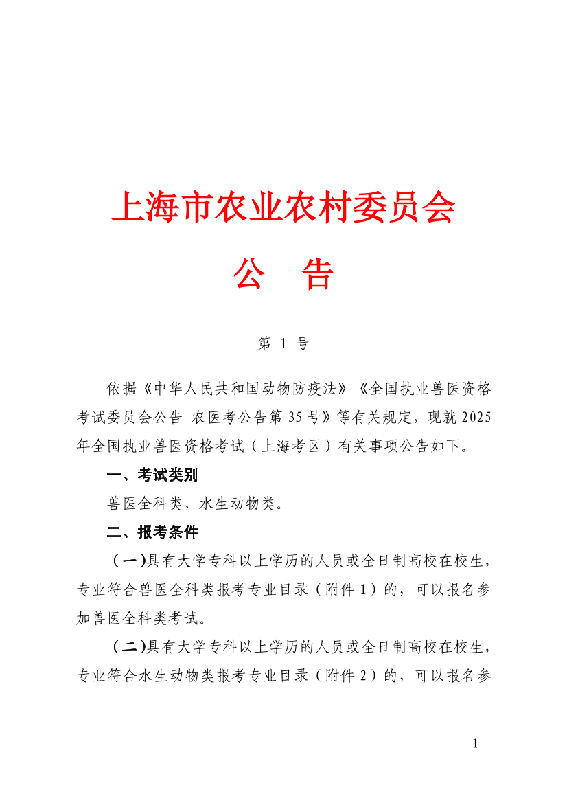 依据《中华人民共和国动物防疫法》《全国执业兽医资格考试委员会公告 农医考公告第35号》等有关规定,现就2025年全国执业兽医资格考试(上海考区)有关事项公告如下。