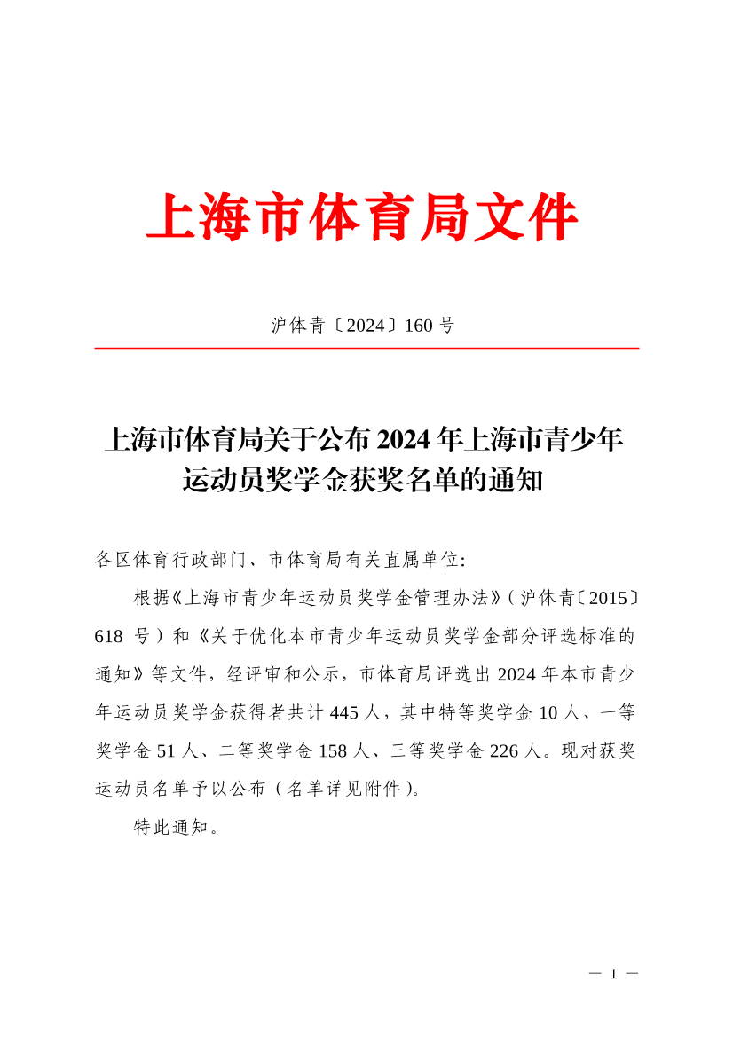 根据《上海市青少年运动员奖学金管理办法》(沪体青〔2015〕618号)和《关于优化本市青少年运动员奖学金部分评选标准的通知》等文件,经评审和公示,市体育局评选出2024年本市青少年运动员奖学金获得者共计445人,其中特等奖学金10人、一等奖学金51人、二等奖学金158人、三等奖学金226人。现对获奖运动员名单予以公布(名单详见附件)。