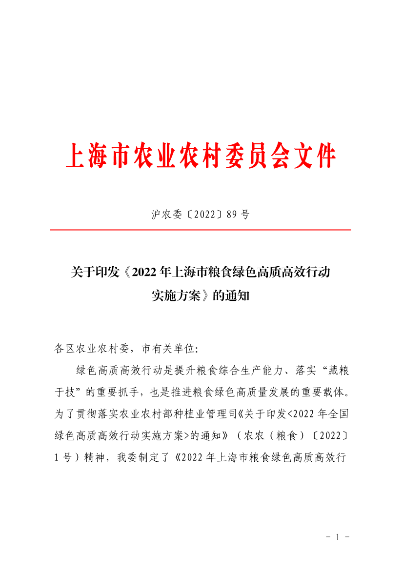 绿色高质高效行动是提升粮食综合生产能力、落实“藏粮于技”的重要抓手,也是推进粮食绿色高质量发展的重要载体。为了贯彻落实农业农村部种植业管理司《关于印发<2022年全国绿色高质高效行动实施方案>的通知》(农农(粮食)〔2022〕1号)精神,我委制定了《2022年上海市粮食绿色高质高效行动实施方案》,现印发你们,请结合实际,切实抓好落实。