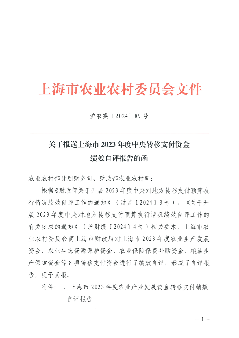 附件:1. 上海市2023年度农业产业发展资金转移支付绩效自评报告