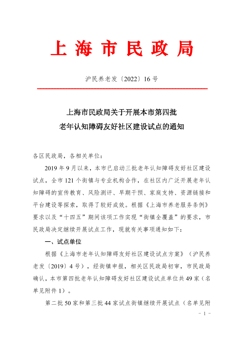 根据《上海市老年认知障碍友好社区建设试点方案》(沪民养老发〔2019〕4号),经街镇申报,相关区民政局初审,市民政局确认,本市第四批老年认知障碍友好社区建设试点单位共49家(名单见附件1)。