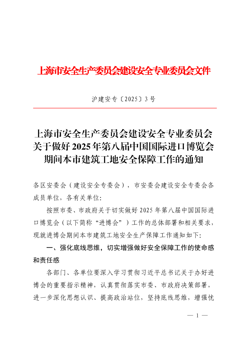 按照市委、市政府关于切实做好2025年第八届中国国际进口博览会(以下简称“进博会”)工作的总体部署和相关要求,现就进博会期间本市建筑工地安全生产保障工作通知如下:
