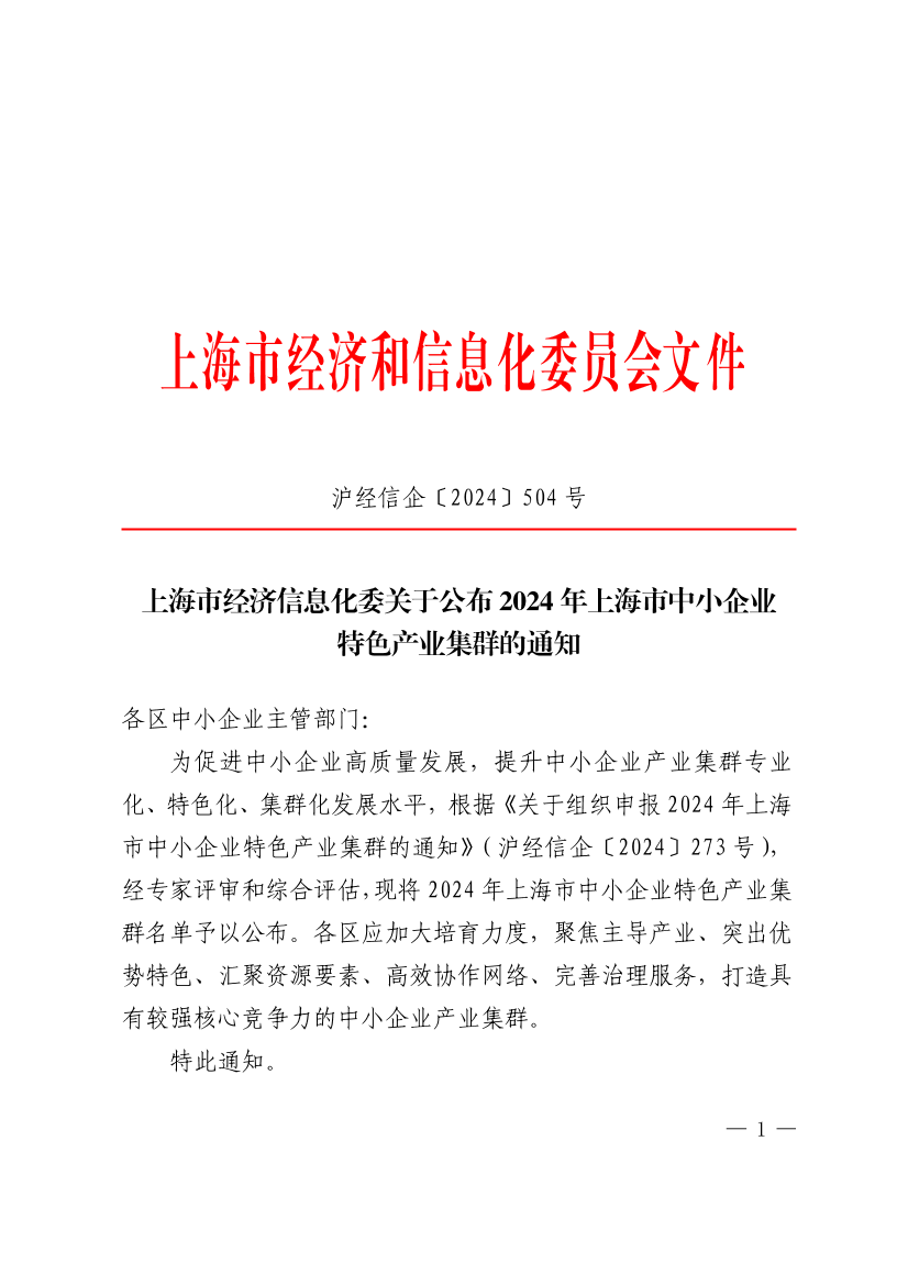 为促进中小企业高质量发展,提升中小企业产业集群专业化、特色化、集群化发展水平,根据《关于组织申报2024年上海市中小企业特色产业集群的通知》(沪经信企〔2024〕273号),经专家评审和综合评估,现将2024年上海市中小企业特色产业集群名单予以公布。各区应加大培育力度,聚焦主导产业、突出优势特色、汇聚资源要素、高效协作网络、完善治理服务,打造具有较强核心竞争力的中小企业产业集群。