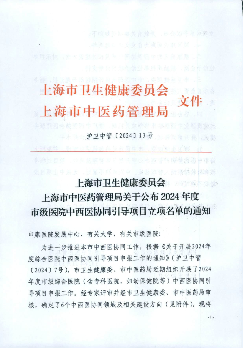 为进一步推进本市中西医协同工作,根据《关于开展2024年度综合医院中西医协同引导项目申报工作的通知》(沪卫中管〔2024〕7号),市卫生健康委、市中医药局近期组织开展了2024年度市级综合医院(含专科医院,妇幼保健院等)中西医协同引导项目申报工作。经专家评审并经市卫生健康委、市中医药局审核,确定了6个中西医协同领域及相关建设方向(见附件)。现将立项名单予以公布,并就有关事项通知如下:
