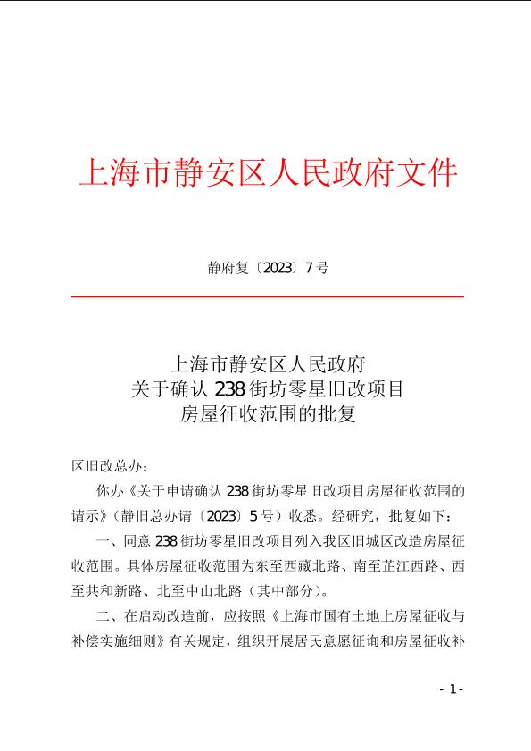 你办《关于申请确认238街坊零星旧改项目房屋征收范围的请示》(静旧总办请〔2023〕5号)收悉。经研究,批复如下:
