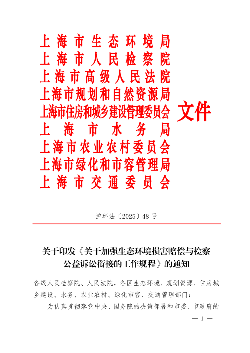 为认真贯彻落党中央、国务院的决策部署和市委、市政府的工作要求,进一步加强生态环境损害赔偿与检察公益诉讼的衔接配合,根据最高人民检察院、生态环境部联合印发的《关于加强生态环境损害赔偿与检察公益诉讼衔接的意见》(高检发办字〔2024〕237号)以及市生态环境局等十八部门联合印发的《上海市生态环境损害赔偿工作实施细则》(沪环规〔2024〕5号)有关规定,我们制定了《关于加强生态环境损害赔偿与检察公益诉讼衔接的工作规程》。现印发给你们,请结合实际认真组织实施。