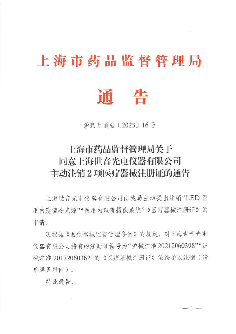 上海世音光电仪器有限公司向我局主动提出注销“LED医用内窥镜冷光源”“医用内窥镜摄像系统”《医疗器械注册证》的申请。
