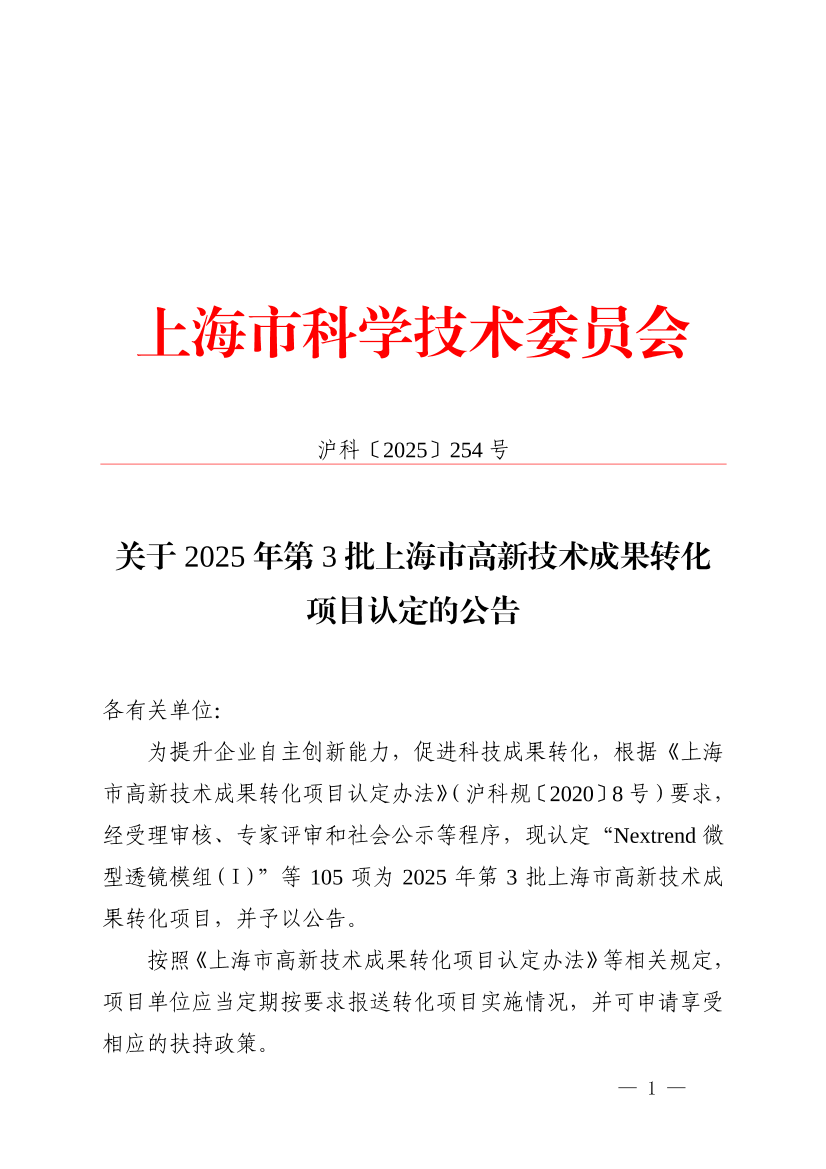 为提升企业自主创新能力,促进科技成果转化,根据《上海市高新技术成果转化项目认定办法》(沪科规〔2020〕8号)要求,经受理审核、专家评审和社会公示等程序,现认定“Nextrend微型透镜模组(Ⅰ)”等105项为2025年第3批上海市高新技术成果转化项目,并予以公告。