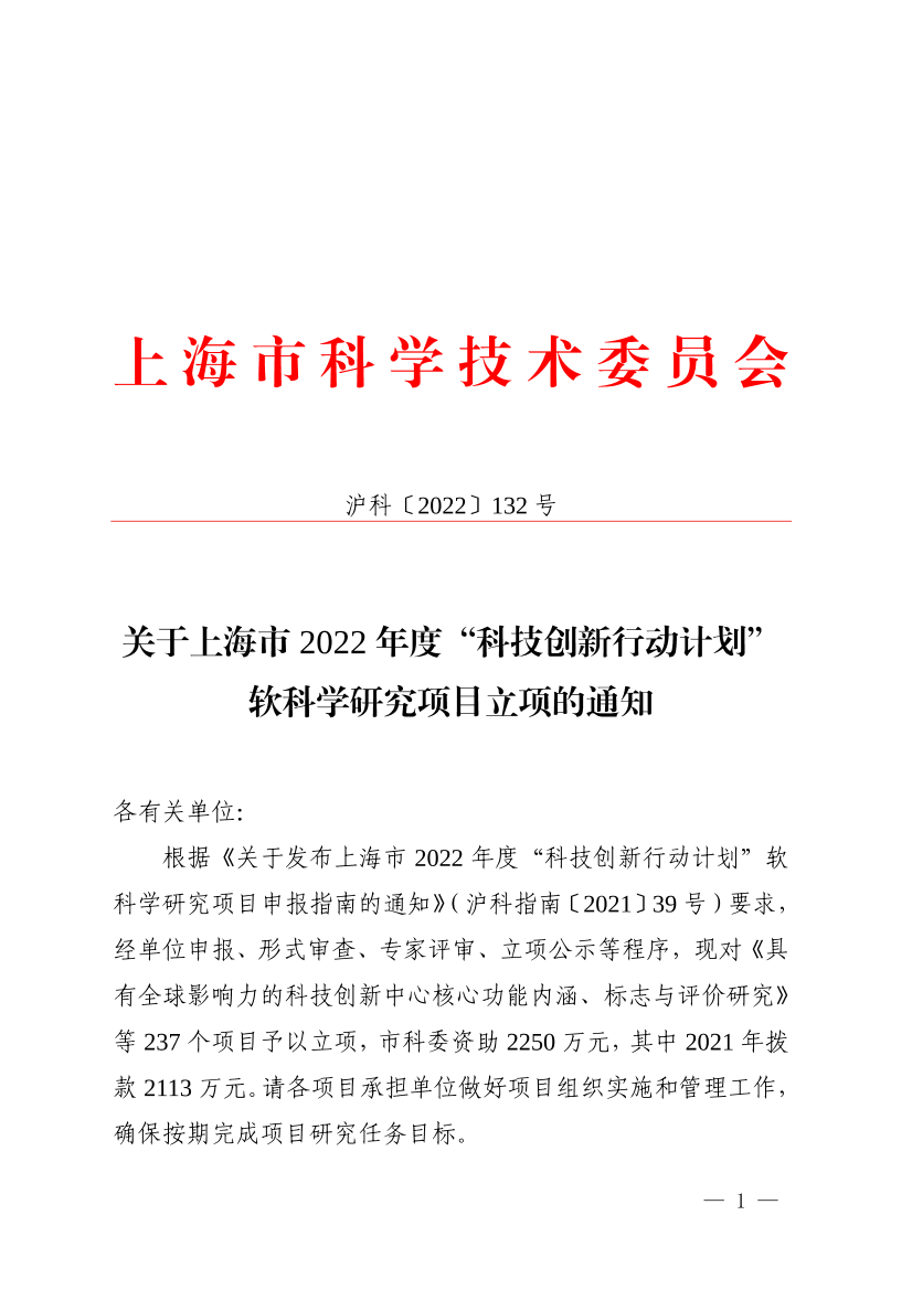 根据《关于发布上海市2022年度“科技创新行动计划”软科学研究项目申报指南的通知》(沪科指南〔2021〕39号)要求,经单位申报、形式审查、专家评审、立项公示等程序,现对《具有全球影响力的科技创新中心核心功能内涵、标志与评价研究》等237个项目予以立项,市科委资助2250万元,其中2021年拨款2113万元。请各项目承担单位做好项目组织实施和管理工作,确保按期完成项目研究任务目标。