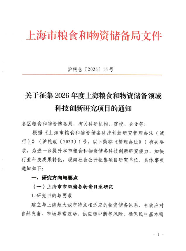 根据《上海市粮食和物资储备科技创新研究管理办法(试行)》(沪粮规〔2023〕1号,以下简称《管理办法》)有关要求,为进一步提升本市粮食和物资储备科技创新研究能力,加快行业科技成果转化,现向社会公开征集项目研究单位。具体事项通知如下: