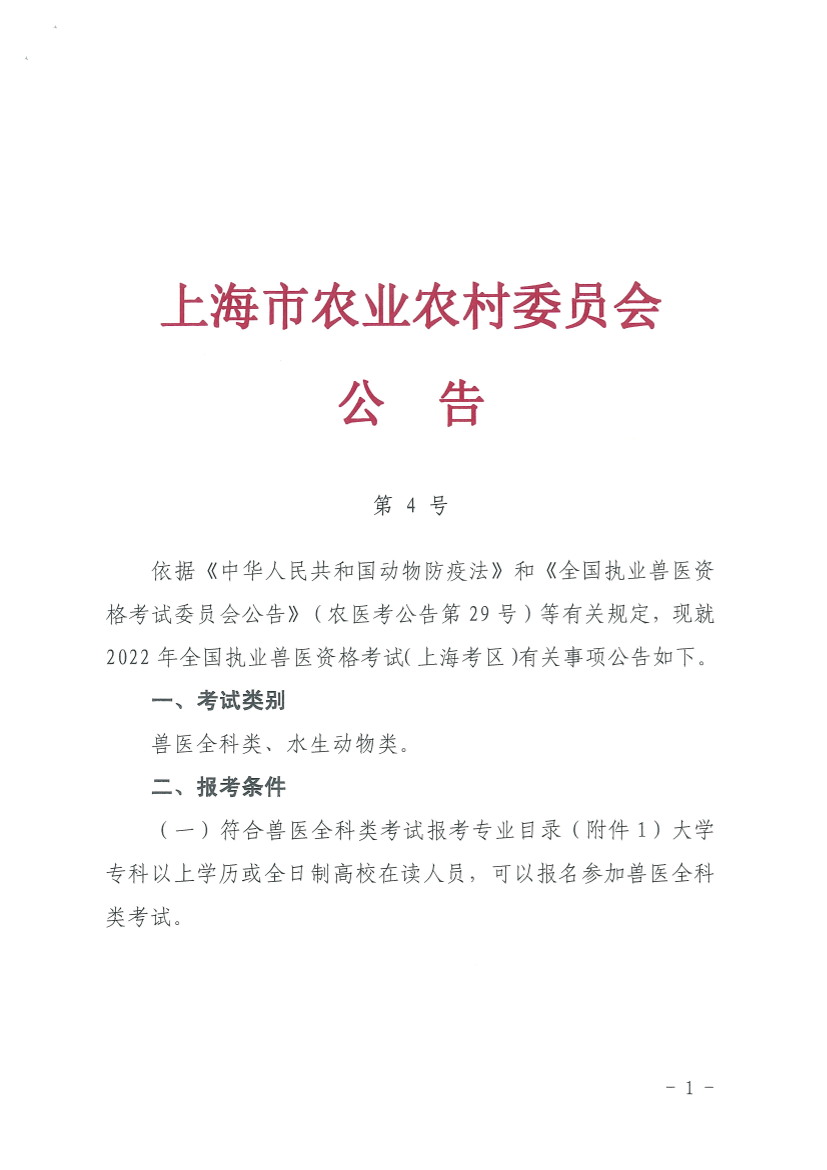 依据《中华人民共和国动物防疫法》和《全国执业兽医资格考试委员会公告》(农医考公告第29号)等有关规定,现就2022年全国执业兽医资格考试(上海考区)有关事项公告如下。