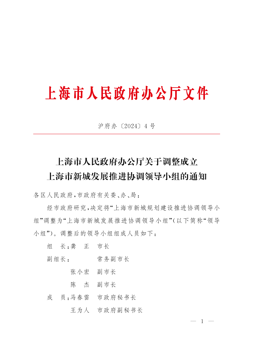 经市政府研究,决定将“上海市新城规划建设推进协调领导小组”调整为“上海市新城发展推进协调领导小组”(以下简称“领导小组”)。调整后的领导小组组成人员如下: