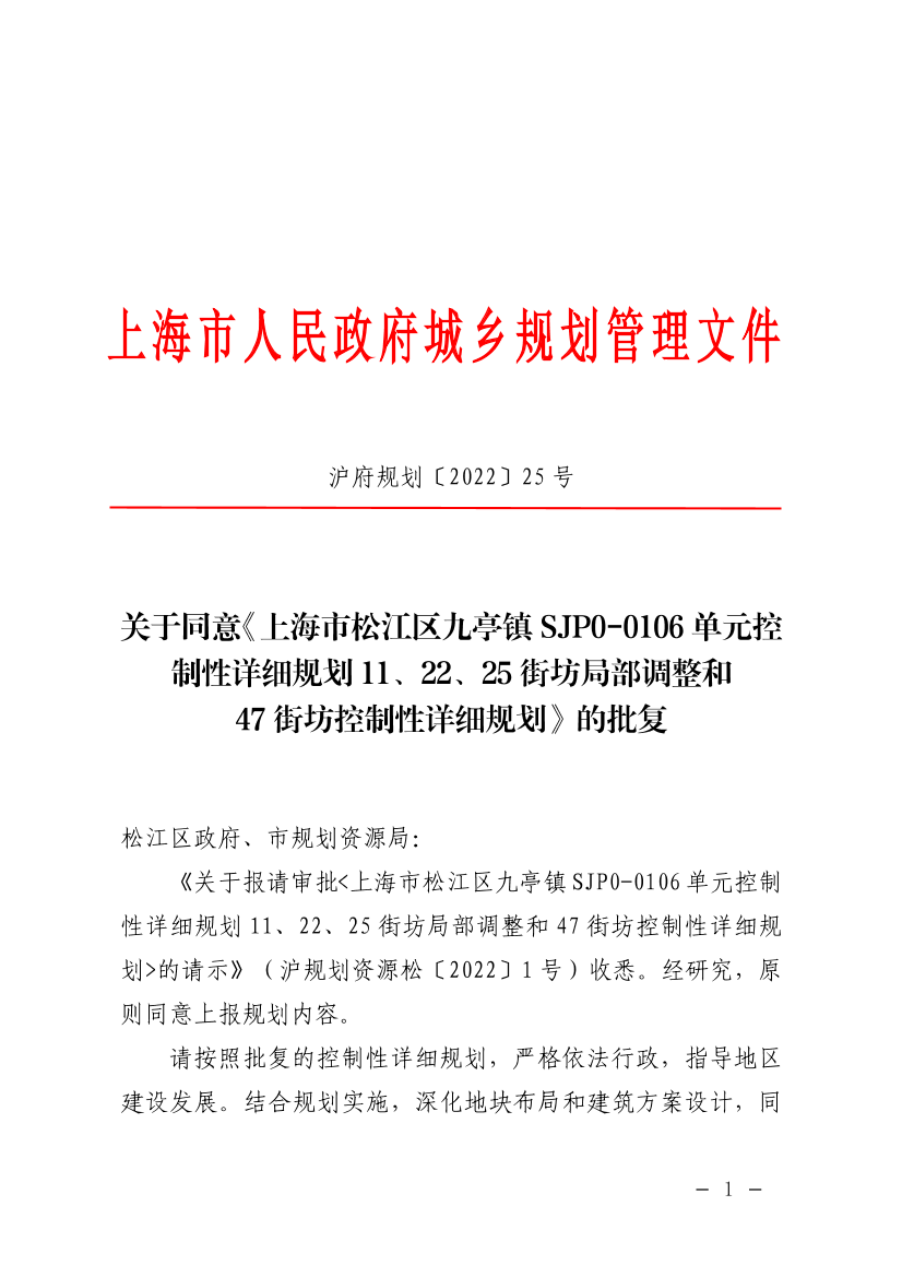 《关于报请审批<上海市松江区九亭镇SJP0-0106单元控制性详细规划11、22、25街坊局部调整和47街坊控制性详细规划>的请示》(沪规划资源松〔2022〕1号)收悉。经研究,原则同意上报规划内容。