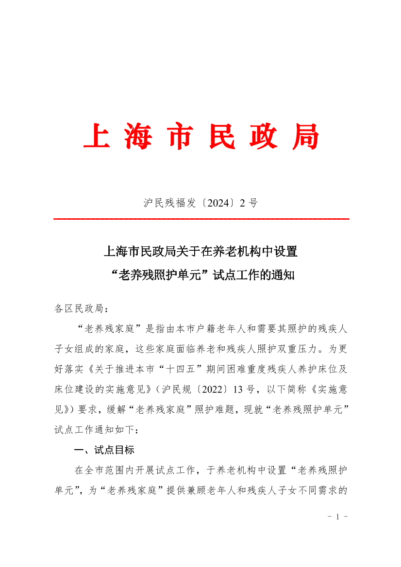 “老养残家庭”是指由本市户籍老年人和需要其照护的残疾人子女组成的家庭,这些家庭面临养老和残疾人照护双重压力。为更好落实《关于推进本市“十四五”期间困难重度残疾人养护床位及床位建设的实施意见》(沪民规〔2022〕13号,以下简称《实施意见》)要求,缓解“老养残家庭”照护难题,现就“老养残照护单元”试点工作通知如下: