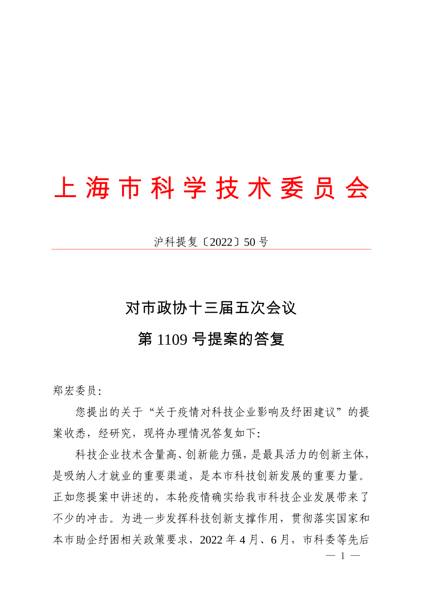 科技企业技术含量高、创新能力强,是最具活力的创新主体,是吸纳人才就业的重要渠道,是本市科技创新发展的重要力量。正如您提案中讲述的,本轮疫情确实给我市科技企业发展带来了不少的冲击。为进一步发挥科技创新支撑作用,贯彻落实国家和本市助企纾困相关政策要求,2022年4月、6月,市科委等先后发布了《全力支持科技企业抗击疫情健康发展的若干措施》、《关于实施“科技助企专项行动”的通知》,综合实施研发支持、创新服务、科技金融、创新券和落实减税减租等举措,全力支持科技企业复工复产、渡过难关。政策也受到科技企业等各方关注。