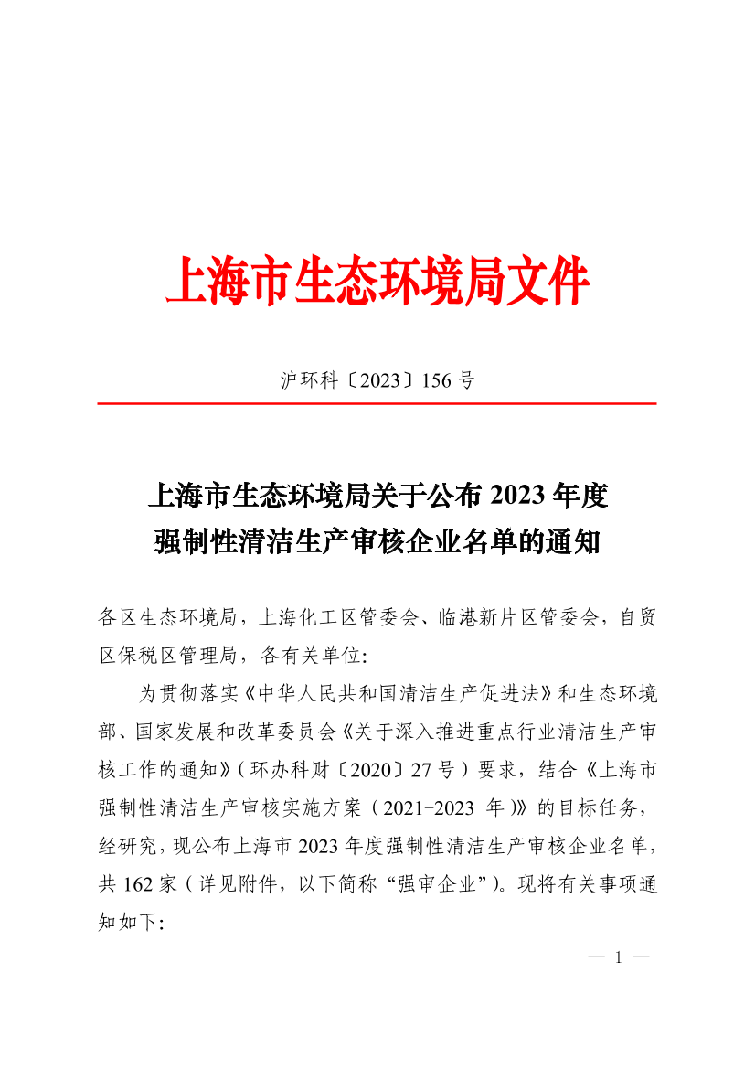 为贯彻落实《中华人民共和国清洁生产促进法》和生态环境部、国家发展和改革委员会《关于深入推进重点行业清洁生产审核工作的通知》(环办科财〔2020〕27号)要求,结合《上海市强制性清洁生产审核实施方案(2021-2023年)》的目标任务,经研究,现公布上海市2023年度强制性清洁生产审核企业名单,共162家(详见附件,以下简称“强审企业”)。现将有关事项通知如下: