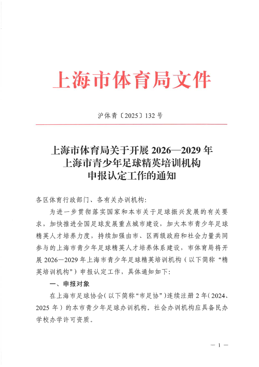 为进一步贯彻落实国家和本市关于足球振兴发展的有关要求,加快推进全国足球发展重点城市建设,加大本市青少年足球精英人才培养力度,持续加强由市、区两级政府和社会力量共同参与的上海市青少年足球精英人才培养体系建设,市体育局将开展2026—2029年上海市青少年足球精英培训机构(以下简称“精英培训机构”)申报认定工作,具体通知如下: