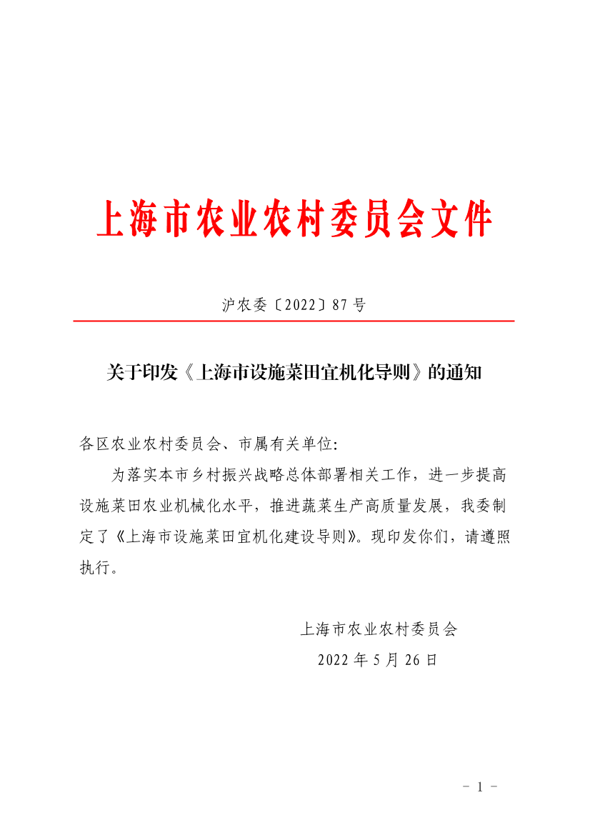 为落实本市乡村振兴战略总体部署相关工作,进一步提高设施菜田农业机械化水平,推进蔬菜生产高质量发展,我委制定了《上海市设施菜田宜机化建设导则》。现印发你们,请遵照执行。