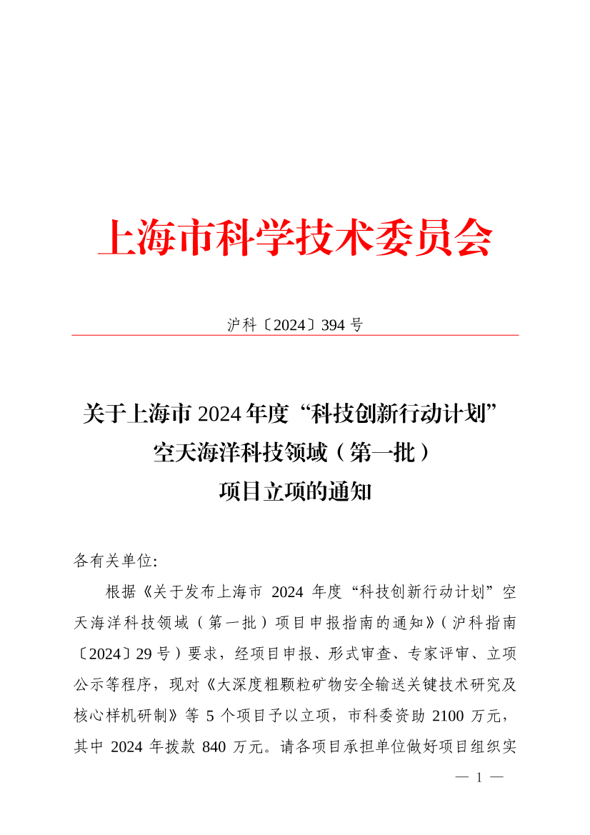 根据《关于发布上海市2024年度“科技创新行动计划”空天海洋科技领域(第一批)项目申报指南的通知》(沪科指南〔2024〕29号)要求,经项目申报、形式审查、专家评审、立项公示等程序,现对《大深度粗颗粒矿物安全输送关键技术研究及核心样机研制》等5个项目予以立项,市科委资助2100万元,其中2024年拨款840万元。请各项目承担单位做好项目组织实施和管理工作,确保按期完成项目研究任务目标。