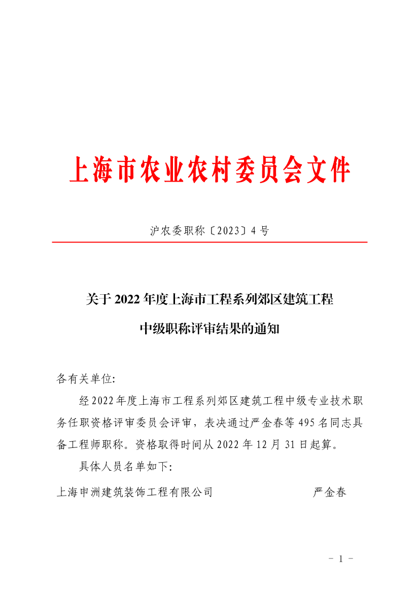 经2022年度上海市工程系列郊区建筑工程中级专业技术职务任职资格评审委员会评审,表决通过严金春等495名同志具备工程师职称。资格取得时间从2022年12月31日起算。