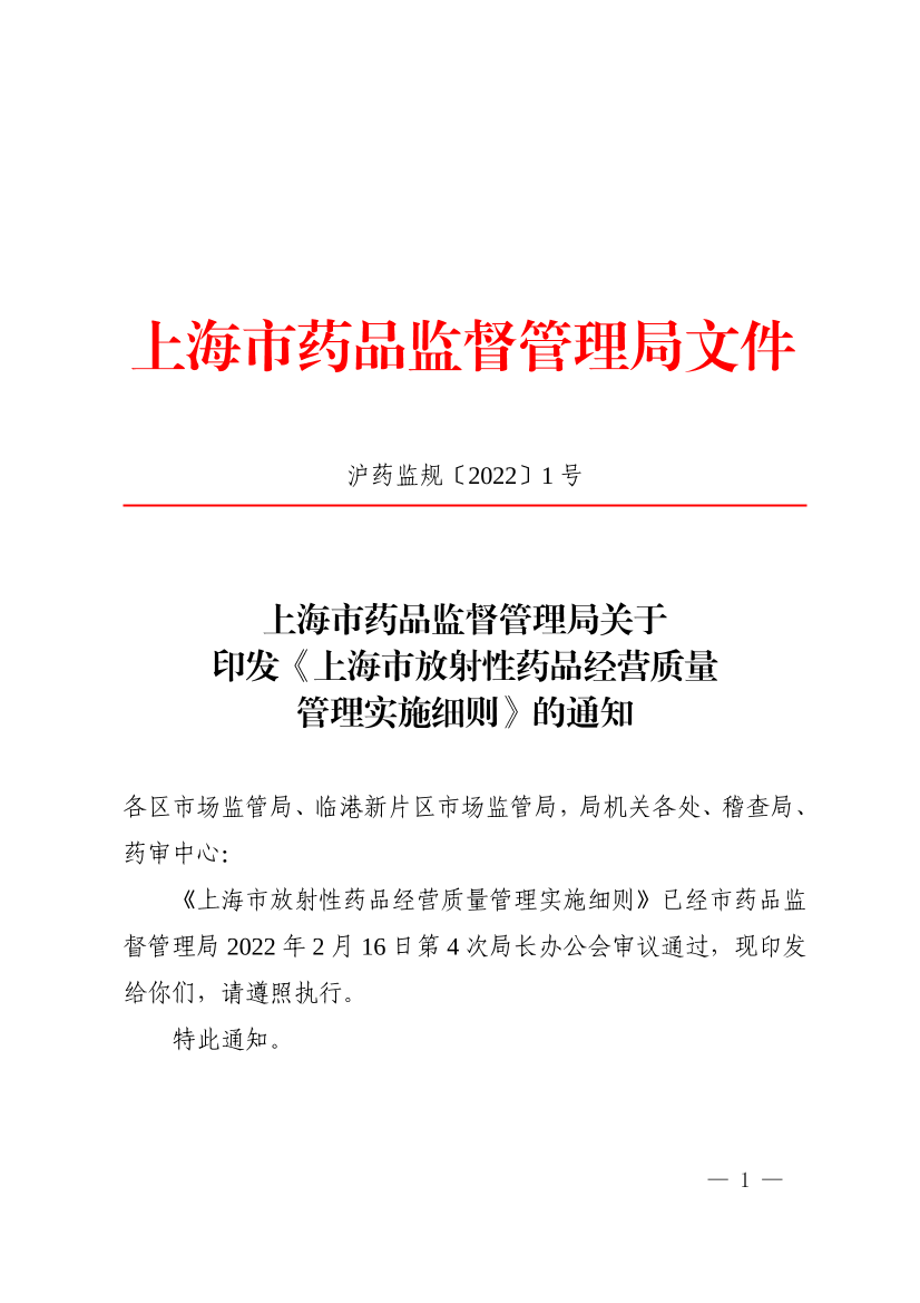 《上海市放射性药品经营质量管理实施细则》已经市药品监督管理局2022年2月16日第4次局长办公会审议通过,现印发给你们,请遵照执行。