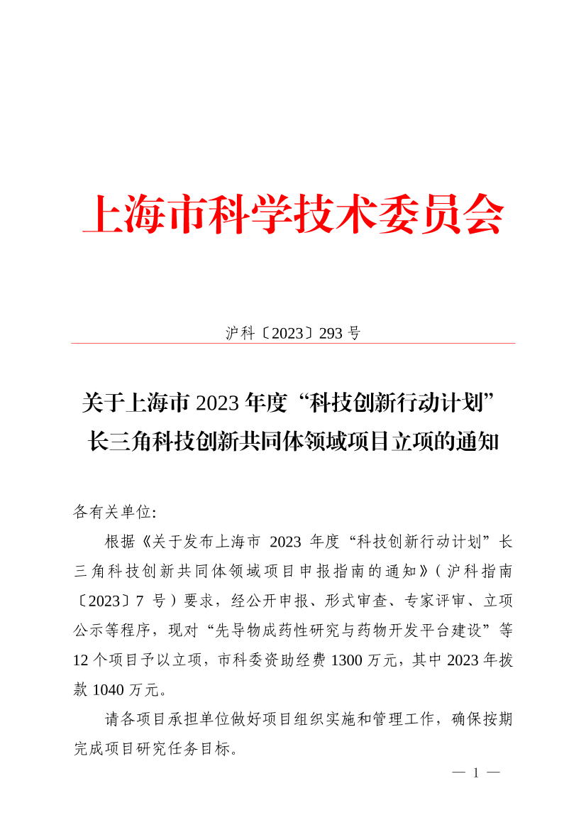 根据《关于发布上海市2023年度“科技创新行动计划”长三角科技创新共同体领域项目申报指南的通知》(沪科指南〔2023〕7号)要求,经公开申报、形式审查、专家评审、立项公示等程序,现对“先导物成药性研究与药物开发平台建设”等12个项目予以立项,市科委资助经费1300万元,其中2023年拨款1040万元。