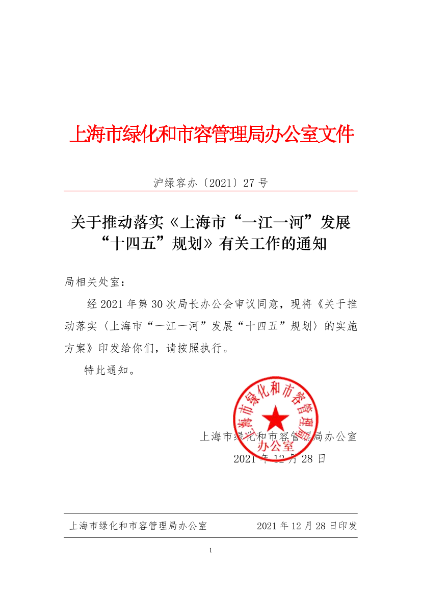 经2021年第30次局长办公会审议同意,现将《关于推动落实〈上海市“一江一河”发展“十四五”规划〉的实施方案》印发给你们,请按照执行。