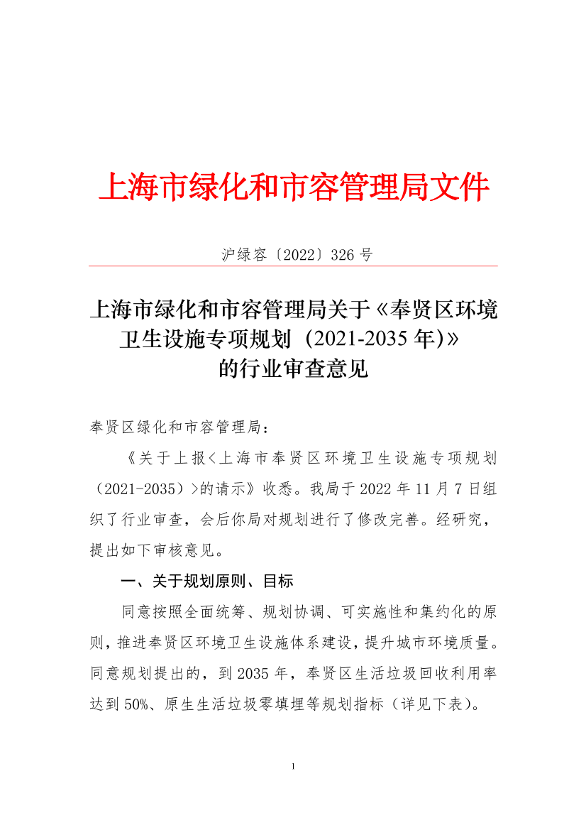 《关于上报<上海市奉贤区环境卫生设施专项规划(2021-2035)>的请示》收悉。我局于2022年11月7日组织了行业审查,会后你局对规划进行了修改完善。经研究,提出如下审核意见。