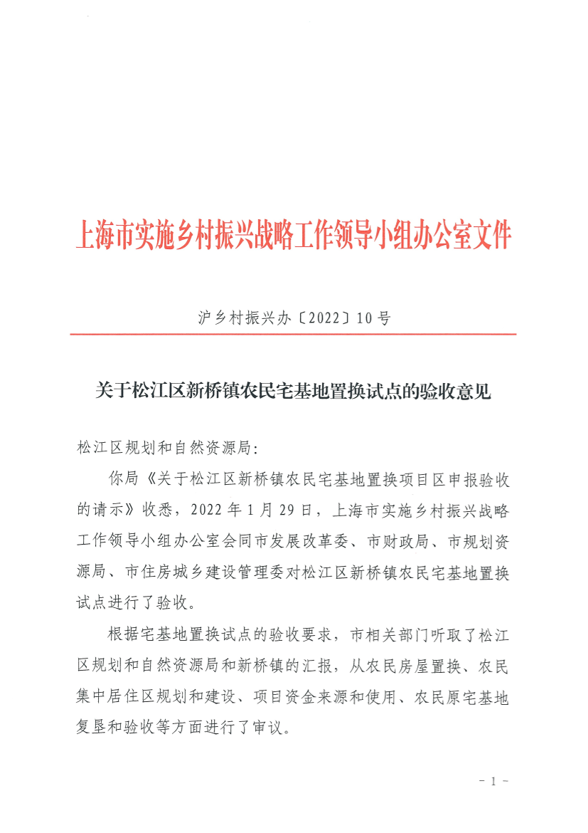 你局《关于松江区新桥镇农民宅基地置换项目区申报验收的请示》收悉,2022年1月29日,上海市实施乡村振兴战略工作领导小组办公室会同市发展改革委、市财政局、市规划资源局、市住房城乡建设管理委对松江区新桥镇农民宅基地置换试点进行了验收。
