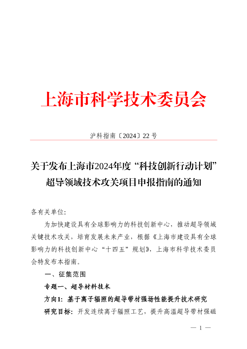为加快建设具有全球影响力的科技创新中心,推动超导领域关键技术攻关,培育发展未来产业,根据《上海市建设具有全球影响力的科技创新中心“十四五”规划》,上海市科学技术委员会特发布本指南。