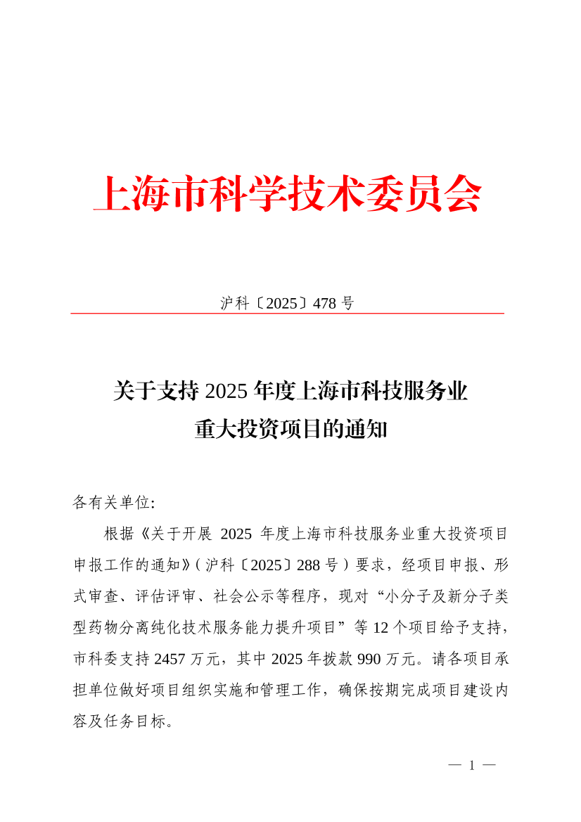 根据《关于开展2025年度上海市科技服务业重大投资项目申报工作的通知》(沪科〔2025〕288号)要求,经项目申报、形式审查、评估评审、社会公示等程序,现对“小分子及新分子类型药物分离纯化技术服务能力提升项目”等12个项目给予支持,市科委支持2457万元,其中2025年拨款990万元。请各项目承担单位做好项目组织实施和管理工作,确保按期完成项目建设内容及任务目标。