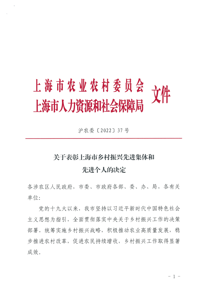 为全面贯彻实施乡村振兴战略,充分调动我市社会各界积极参与乡村振兴,发挥先进典型的模范带头作用,传播正能量、形成感召力、营造好氛围,经单位推荐、专家评审,上海市农业农村委员会、上海市人力资源和社会保障局决定,授予浦东新区惠南镇海沈村村民委员会等50个集体“上海市乡村振兴先进集体”称号;授予沈彪等100名同志“上海市乡村振兴先进个人”称号。