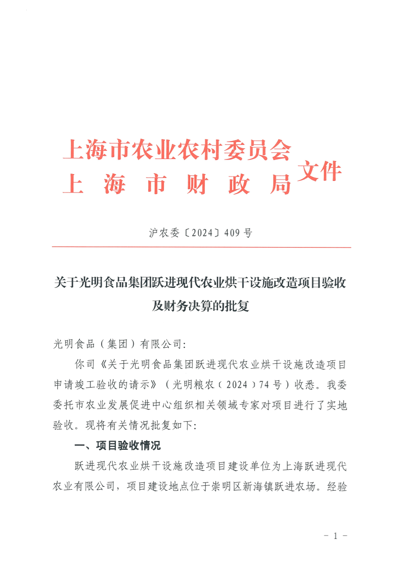 你司《关于光明食品集团跃进现代农业烘干设施改造项目申请竣工验收的请示》(光明粮农﹝2024﹞74号)收悉。我委委托市农业发展促进中心组织相关领域专家对项目进行了实地验收。现将有关情况批复如下: